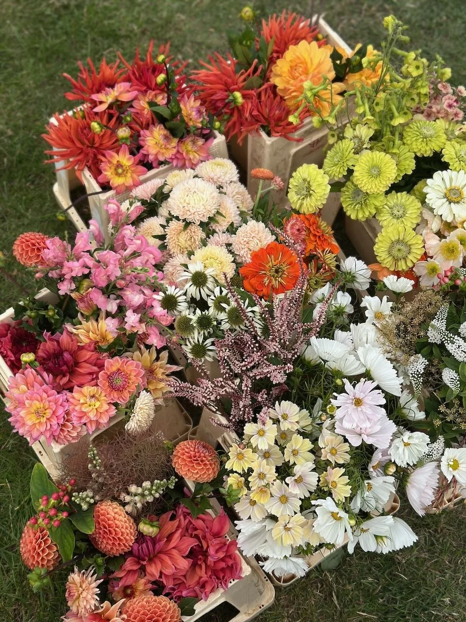 We grow to three main colour schemes: whites & greens, pales & pastels, and jewel & brights (if you have a different colour palette in mind, let us know when you order). We cut all your flowers to order according to your chosen colour palette and what kind of arrangements you plan to make with them (urns for instance, or table centres, or bud vases etc, see the bucket choices below). Collection is from the farm. You will need to bring clean buckets or waterproof containers to take your flowers away in.
